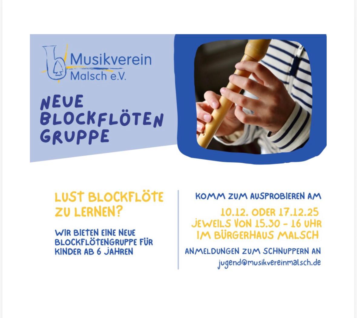 Wir starten eine neue Blockflötengruppe ab 6 Jahren und freuen uns, wenn DU dabei bist! Komm gerne zum Ausprobieren vorbei am 10.12.25 oder 17.12.25 jeweils von 15.30 -16.00 Uhr im Bürgerhaus Malsch. Anmeldung an jugend@musikvereinmalsch.de.